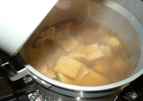マジック鍋を使って鶏の肉団子と厚揚げの煮物を作る。噴かない、マジック鍋の凄さはとにかく噴かない。蓋の合わせが、なんと6センチもあるので、全く吹きこぼれる様子がない。鍋の蓋の形も独特なので水分の蒸発量が少ないみたいで、料理の表面が焼けると言う事がない。これはかなり優れもの。なんで市場から消えたのか・・・・謎だ。大きすぎるからかも知れぬ。(笑)