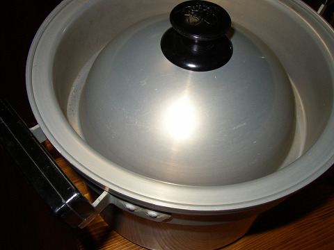 今日、家に帰ったら友人から「マジック鍋」というものが届いていた。マジック鍋?と思いいろいろ検索したがヒットしない。友人によると30年ほど前の鍋らしい。特徴としては蓋の繰りが深く、鍋の内側との接点が大きい。どうやら、簡易圧力鍋の構造を持っているらしい。短時間、省エネルギーで煮込みが出来そうだ。大きさもかなりあり、カレーやシチューに威力を発揮しそうである。スープを取るのにも良さそうだ。この週末試験的に使用してみようと思う。友人も料理には一家言あり、(元プロだもの)指南して頂くことにしよう。30年もの時間を経て、初めて我が家で使われるこの鍋も持てる力を発揮してくれるかな。荒俣宏氏の『謎の古道具を探せ』みたいだな。(笑)