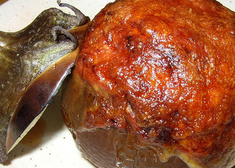京野菜の中でも有名な賀茂茄子を使った料理です。普通に使っても面白くないと考えて、イタリアンに仕込みました。「賀茂茄子のグラタン」賀茂茄子をくり抜いて中に海老、烏賊などの魚介類を入れました。生のままではなくてフライパンでガーリックと炒めて香りを付けています。ソースはクリームではなくてトマト系、ペスカトーレのソースに似せました。 ソースには火が通っているので、茄子が柔らかくなるまでオーブンで熱します。180℃20分くらいです。上にはチーズをたっぷり。中はこんな感じ、茄子の皮がもう少し柔らかかったらベストでした。