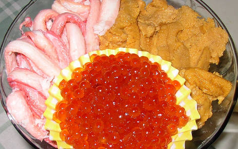 海鮮三種盛りおにぎりに合わせたり、巻きずしに合わせたり。そのまま食べたり。結構重宝しました。高坏の硝子の器に入っています。 こんな感じ。後ろはチーズの三種盛り。ドライマンゴー添え。始まってしまうとドンドン流れ作業で時間差攻撃になるので、 全体の料理の画像は撮れませんでした。画像には写っていませんが、「ヤガラとカンパチの刺身」「だし巻き卵」 「山芋のスフレ」「親鶏のモモのロースト」「若鶏のタンドールチキン」 「スペアリブロースト」「海鮮巻き」「茄子の揚げ浸し」「カリフラワーと蛸の醤油マリネ」「有頭海老のグリレ」後は酒のあてにカラスミやポークなんちゃら(名前忘れた弟の嫁さんが持ってきていた・・・フランス料理のシェフが作ったって言ってたな・・・塩味が効いたコンビーフみたいで、スパムじゃないけれど、フランスパンと良く合っていた)などがありました。赤ワイン・白ワイン・ビール・チューハイ・自家製サングリア(スペインの甘いフルーツと蜂蜜のお酒です)シャンパン・・・結構空けたな。私は飲まないので「おーいお茶」でした。 ★☆長かった宴も終わりました。新しい年が始まります。みなさん、明けましておめでとうございます。今年もどうかよろしくお願いします。