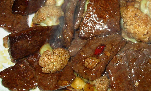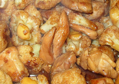 鶏とカリフラワーの炒め物。色合いが良くないのは解っていたが、冷蔵庫に入っていたもので。あるものでしか勝負出来ないのは世の常。調味料は絶対確実の醤油・唐辛子・大蒜。不味かろうはずがございません。料理というのはシンプルなものが一番。何だか人間の味と同じ感じがする。ゴチャゴチャ飾れば、飾るほどぶざま。語れば語るほどぼろが出る。語るに落ちたとはこのことか。ハイ!(笑)