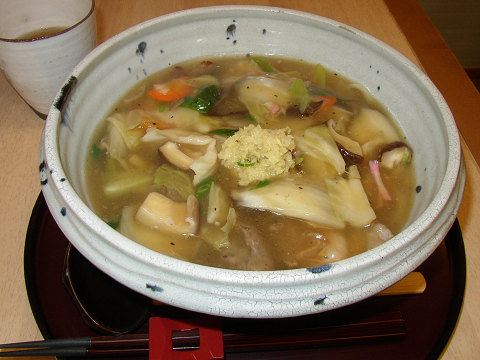 うえだの八宝うどんです。薄目に味付けられた八宝菜がかかっています。とろみが充分効いていてあんかけうどんのようです。味付けは中華、中華というようなものでなく、和風が前面に出ています。野菜入りあんかけうどんと言った感じ。寒い日には暖まります。うえだの定番メニューです。