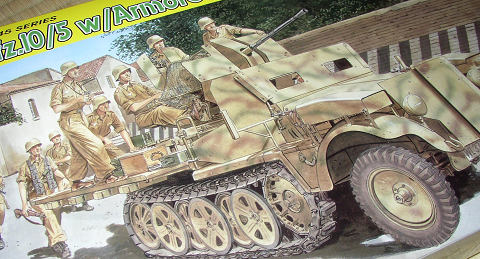 1tハーフトラック 20ミリ対空砲搭載Sd.Kfz.10/5 小型のハーフトラックです。先日発売された、同型車両の追加装甲板のものです。ランナーとしては小さなものが一枚追加されているようです。しかし、最近のドラゴンの製品は、薄い装甲板もプラスチックで極力薄く作られています。今まではエッチングで表現していたものがインジェクションで上がってくるので、表面のリベットの様子がリアルに再現されています。それにしても小さな車両。現在のワンボックスカーの方が大きいかも知れない。