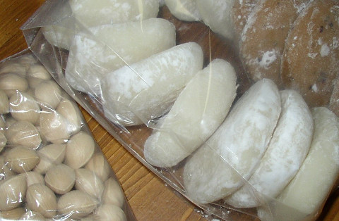 正月用の餅と銀杏が届きました。色の付いたものは栃餅。あんこが入ったものもあります。自家製なので手が込んでいます。栃の実は灰汁が強いので灰を混ぜて灰汁取りをします。もちろん田舎の親戚がやってくださるのですが・・・なかなか買ってもこれだけのしっかりした栃餅はありません。有り難いことです。関東の方には不思議かも知れませんが、京都では丸餅です。正月から餅に角が立ったり、刃を入れたりするのは良くありません。焼きもしません。焦げるのも良くありません。凄まじき「言霊」信仰です。雑煮は白みそ(西京みそ)です。朱塗りの椀に白みそ白丸餅のみ。紅白を演出します。場所によっては、頭餅を入れるらしいですが我が家は吉田(京大の近所です)の作り方らしく・・(実質よく知らない)餅と味噌だけのお供えみたいな雑煮です。まぁ儀式ですから(笑)妻は明石の出身なのですまし汁に焼き丸餅、野菜や穴子(明石は鯛や蛸というイメージありますが一番の特産品は穴子らしいです)が入っているそうです。野菜を少しに、焼いた鯛の切り身を入れたらメチャ美味そうだけど。 地方それぞれ、各地の雑煮オンパレードで食べてみたいものです。雑煮記念館なんてないかな。★☆ 綺麗な銀杏です。以前は職場にたくさんの銀杏の木があったので、掃除を兼ねて銀杏拾いをすると、コンテナ一杯ぐらいの銀杏が採れたのですが、道路拡張ですべて切られてしまったので最近は手に入りません。以前は昼休みに隣りの水道局の職員さんと一緒に銀杏拾いをしたものです。コンテナ一杯持って帰ると、決まって綺麗に果肉(これが臭い)を外して種状にしたものを三袋ごっそり持って来てくださいました。私の職場で分配。持ちつ持たれつでした。(笑)これは田舎の銀杏。綺麗な状態で頂きました。後は炒り器でゆっくりと炒るだけ。焦げ目が付いたぐらいが美味いです。正月が来たなという感じです。