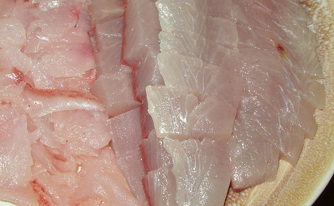 (画像左が赤ヤガラ、右がカンパチです。食べる際には綺麗に盛りつけます。冷蔵庫満タン) 今日、突然ではありますが。五島列島から帰った従兄弟が、赤ヤガラとカンパチ、キハダマグロを持ってきました。仕事の釣りの釣果らしいです。仕事はリールの商品開発をしているので、実地試験らしい。仕事とはいえ羨ましい。(本人は変わって欲しいくらいしんどいと・・・)私は温々と釣果を料理しましましょう。赤ヤガラはメチャメチャ美味いのですが、量の問題もあって、高級料亭にしか廻りません。頭を落として帰ってきてくれたので、三枚におろしてそぎ切りです。皮が薄いので、皮剥が難しいですから。モチモチとしてそれでいて濃厚。生の鱧を食べたらこんな感じかな(よく解らん)初めて食べました。(゚Д゚)ウマー!(゚Д゚)ウマー! カンパチの造りはいつものように三枚におろして、皮を剥いで背身と腹身に分けました。これも実に美味い。脂がのっています。この頃のカンパチは美味しいね。明日はキハダマグロを造ります。