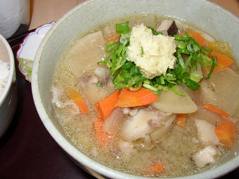 上田の今月の定食。「豚汁うどん」800円みそ汁仕立てのうどん。うどんに合わせるように、薄目に味噌味が付いている。かといって、味が薄いわけではない。中には具だくさんの野菜と豚肉。きっちりと味が染みこんでいて、あらかじめ仕事がしてある。たっぷりの生姜を載せていただく。もちもちの麺に具だくさんの野菜が嬉しい。店を出たときには汗が噴き出ていたよ。こんな寒い日には嬉しい一品だ。