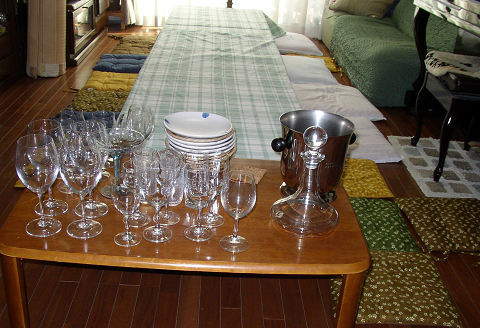 恒例の年越し。机は集積材をボルトと蝶螺子で留めたもの。足はポケミスが一杯入った本のコンテナ。クロスを掛けるだけでこんな感じ。演劇の大道具の要領です。(笑)終わればバラして裏の倉庫に入ります。本は書斎に。今晩のための準備は続きます。現在二時。六時開宴。