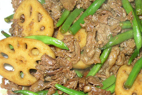 牛肉と蓮根の炒め物。インゲン豆も入れてみました。シンプルだけど、インゲンと蓮根のシャキシャキ感が最高。味付けは醤油メインのシンプルなもの。料理は得てしてシンプルなものが美味い。ちょっと、やんちゃだけど、残ったソースもご飯に掛けて頂きました。申し訳ない。(゚Д゚)ウマー!(゚Д゚)ウマー!