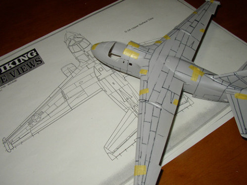 A-3Aバイキングのパネルラインを世界の傑作機と比較しました。サイドのパネルはほとんど同じですが、主翼上面はかなり違います。主翼下面に至っては全くの別物。うーん、出版年月日から考えても書籍が正しいのでしょうね。1/101に縮尺されているものを140%拡大にして原寸大の図面を作りました。凸モールドなのでいじる場合は覚悟を決めて、全面彫り直しになるんでしょう。ヘナヘナと挑戦します。失敗しても、キットとしては廉価だし、定番だから入手しやすいよね。