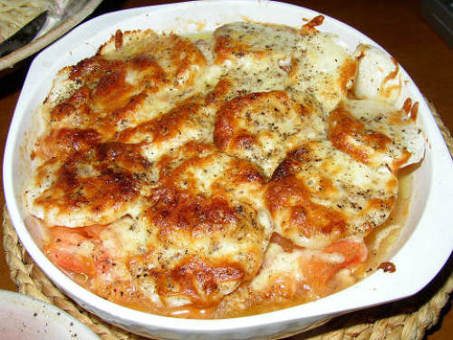 トマトのザク切りの上に山芋の輪切りをのせます。続いてオリーブオイル、塩胡椒を振りかけ、チーズをトッピングしてオーブンへ。 ただそれだけの料理です。味が薄ければ私は醤油をかけます。トマトの酸味と山芋のサクサク感が良いですよ。