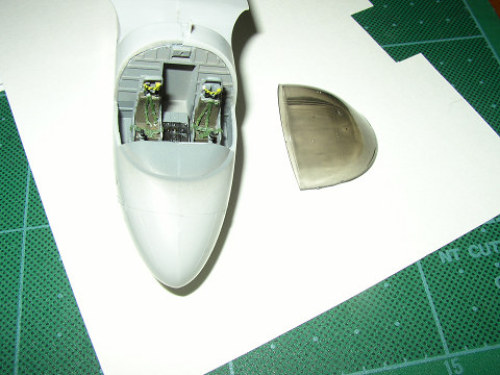 手が遅いながら今日はスモークグレーをキャノピーに塗装しました。透明のキャノピーにはスモークが入っているので、まあ、ここは塗装をすべきなんですがどの程度塗ったものかハッキリ判りません。写真等で実機を確認してみると黒に近く中は全く見えない。と言って真っ黒になるまで塗るというのは芸がないので画像の程度に塗ってみました。機体に付けてみるとほとんど中が見えない状態です。実機写真に近づきましたが射出レバーなんかをいじってみたのが全く判別できません。(笑)シートベルトもでっち上げなのでこんなものでしょう。自己満足の世界ですね。
