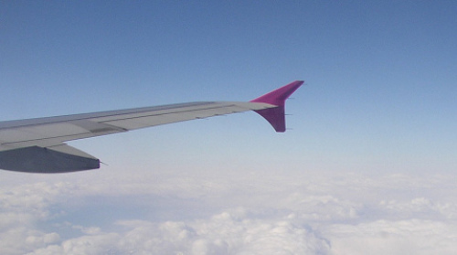 ピーチエアバスA320のウイングチップです。帰りの座席は30-A。最後尾の窓際の席でした。窓からは翼の状態がよく見えます。エアバスの特徴的なウイングチップフェンス。そこに付いてる4本の放電索(スタティックディスチャージャー)。翼端のエルロンには等間隔に5本の放電索が付いています。フェアリングにもぴょこっと1本付いています。ああ、良い席に座れた。