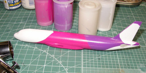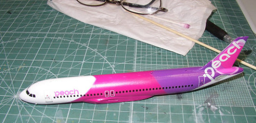 アヴィエーションピーチのエアバスA320です。何とかここまでたどり着きました。マスキングをはずしてから、塗料の蓋をカチッと閉めたとき、瞬間に塗料が飛び散りました。密閉度の高いフィルムケースを使っていますので、気をつけないと飛ぶことは判っていました。ちょっと気を抜いた罰です。 最悪です。機体に紫色の点々が・・・・仕方ないのでもう一度マスキングをして、塗装をやり直しました。何とも一瞬にして心が折れるというのはこのことでしょう。後方の塗り分けラインの膨らみが少し足らないようですが、もう良いです。★☆フィルムケースは以前から塗料の調色用に使っています。45リットルのゴミ袋に一杯と、段ボールに1個とかなりのストックがあります。これは便利な塗料入れなのですが、最近ではフィルムカメラが使われなくなり貴重になってきています。出入りの業者さんに頼んで何とか集めていますが、いつかはなくなってしまうのが辛いですわ。 垂直尾翼のデカールを貼ってみました。結構、薄いデカールでビックリしています。薄いせいで白の色は下地が透けて見えます。垂直尾翼の多重円の部分は白抜きにしたので発色は良いのですが、「P」と「h」の部分は塗装の上に載っているので如何せん色味が変わってしまいます。