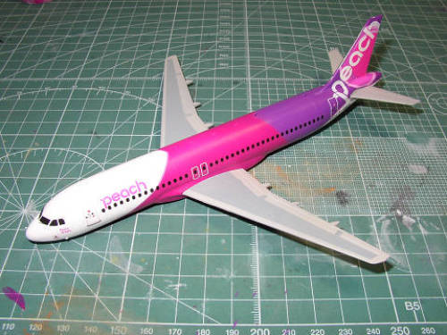 エアバスA320 ピーチピンク色のデカールは入っていないので必ず塗り分けが必要です。この塗り分けの微妙なラインを再現するには、まず原寸大の塗装図が必須です。コピー機でサイドと上面下面を縮尺に従って拡大コピー。ついでにデカールの曲面ラインをコピーして切り抜きます。後はそれに従ってマスキングテープを切り出し貼り付けることになります。これが結構手間です。巧くカーブが取れないし折り返しのカーブ面が微妙です。まずは中央のピンクから塗装して、もう一度、機体後部のピンクのラインをとりましょう。おっと、色目から言えば逆ですね。 垂直尾翼にはデカールの型にマスキングを切り抜いて・・・今日はここで力尽きました。試行錯誤して4度ばかり失敗しています。なかなか完成品を手に入れるのは難しいです。入門の旅客機キットではないですね。プラモデル 1/200 ピーチ・アヴィエーション エアバスA320[ハセガワ]《取り寄せ※暫定》