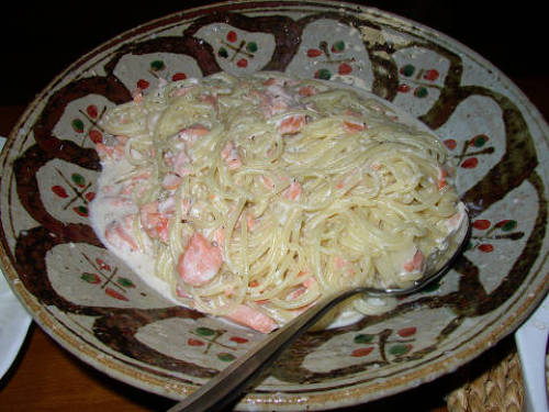 スモークサーモンと生クリームで作ったパスタ。胡椒を効かせて頂きます。パスタは簡単で美味いよなぁ。