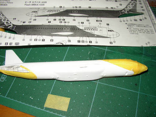 亀のように鈍い工作スピードですが、やっと士の字になりました。なんちゃってピーチA320でございます。これから、残りのデカール。エンジンの装着。ランディングギアの装着。クリアの塗装。と先はまだまだです。
