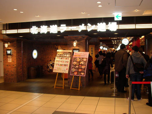 千歳空港の中にあるフードコート「北海道ラーメン道場」入り口にある「海老塩ラーメン一幻」にはすごい行列が出来ていました。海老の薫りが空港内に充満しています。何軒もの有名店が軒を並べているので、さすがに並んで「一幻」は勘弁。中の方にあった「銀波露」に入りました。ここでは豚骨を使った味噌ラーメンが食べられると言うことでした。 それがこの「豚骨味噌ラーメン」バラのチャーシューがドドーンと入っています。その上にゴーターチーズのトッピング。別添えになっていますが、チョロチョロ入れていては絵にならないので、一気に投入。さて、お味は・・・濃厚です。メチャ豚骨のコラーゲンがでています。口に粘り着く感じ。強烈です。そりゃ、お肌に良いのだからガンガン出しましょ。と言うのかも知れないが。歳の私にはかなりハードです。コラーゲンというのは応えるのね。麺は縮れ麺ではなく中太のストレート麺。出て来たときはかなり堅めの感じで茹でてあります。この麺は早く柔らかくなるようです。うひょー、これはフライトに応える、飛んでもない状態になってきました。私としては初めてなのですが、全部麺を食べることが出来ませんでした。当然スープも。若い人にはこれくらいのコッテリが良いのかも知れませんが、負けました。完敗です。