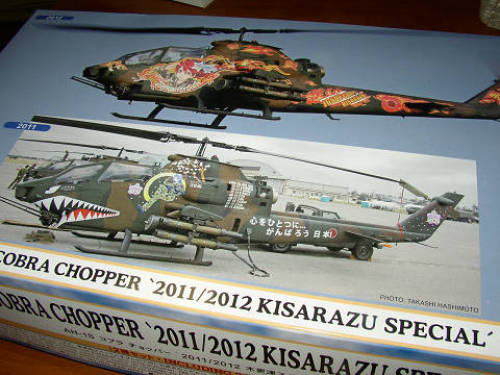 1/72 コブラチョッパー 2011/2012 木更津スペシャル。流行のコンボキットです。買う側としては、どちらかのデカールを選ばなければならないというジレンマに苛まれることなく両方楽しめるから、とても嬉しい。2個買うより少し安い設定。売る側としてはデカール替えだけで、1個よりも高めに値段設定が出来るし、パッケージ代も安く付く。自衛隊のオリジナルキャラクター「木更津あかね」をあしらった機体。2011年バージョンは意外と地味。「こころひとつに、がんばろう日本」の文字が眩しい。2012年バージョンは痛機全開。実機は見たことがないが、片面のみの(左サイド)ペインティングらしい。しかし、模型では右に貼るべき逆サイドバージョンのデカールも入っている。模型は自由だからこの辺りは嬉しいね。全面デカールで楽しめるのは良いことだ。 これは実機の画像。デカールの中には、前の木更津あかねのパネルを作るデカールも入っている。至れり尽くせりだ。★☆兵器にキャラクターデザインして人殺しの機械の恐ろしさを誤魔化しているという、教育ママさん。兵器どんな風にしても恐ろしいですよ。これで「誤魔化している」というあんたの感覚が恐ろしいわ。