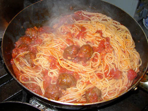 ミートボールをたんまり入れたパスタ。これって、パスタと言うよりスパゲッティと言った方がしっくり来るかも。トマトベースのソースでまとめています。 盛りつけ。別枠でカラリとニンニクで炒めた屈(こごみ)を添えています。春のパスタです。(これだけでかぁ?)