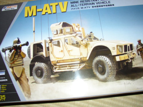 最近、空モノばかりを買っているので、久々のAFVです。キネティックのM-ATV耐地雷軽装甲高機動車。確か、パンダホビーでも同じものが出ていたらしいですが、私はキネティックにしました。現用車輌としては戦車より魅力的です。どうもエイブラムス系の戦車には好きになれなくて・・・この手の方がメカメカしくて好きです。またまた、大きさの割にはゴチャマンとパーツが入っていて、それだけで萌えます。このキットも最近では市場で見かけなくなりましたね。 キネティク アメリカM-ATV耐地雷軽装甲高機動車 ★☆キットレビューなんか見ているとパンダホビーの方がエッチングが多いみたいです。車載の品物などがエッチング表現になっているみたいです。キネティックはインジェクションですね。どちらが良いかは好みの問題ですね。パンダホビー プラモデル 1/35 M-ATV MRAP 対地雷装甲機動車[ホビーリンク・ジャパン]《取り寄せ※暫定》 ここが最安値みたいです。