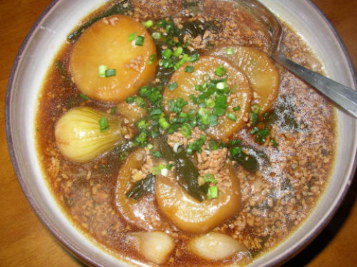 一つ目は、この時期美味しい葉玉葱と大根の煮付け。葉玉葱は、スーパーでもこの時期しか売っていない貴重なものだ。葉はしっかりしていて食感が良く、葱としての味が濃い。玉葱の部分はとても甘くてほっこりしている。豚のミンチで味を付けて醤油味で決める。とろみも付けて味はすき焼き風。美味いなぁ、葉玉葱。★☆ これも野菜の煮物。茄子の田舎煮。田舎になんてちょっと田舎をバカにしてない?と怒る必要なし。見た目は汁気を多くしてあるのでいまいちだが、味は最高。茄子はトロッと煮込むと美味いですね。この料理だと沢山の茄子を一気に食べられます。