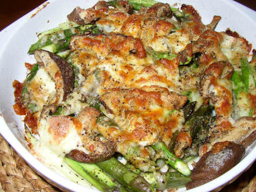 野菜とチーズのオーブン焼き。我が家の定番です。今日はトマトではなくて、アスパラをメインにして焼いてみました。椎茸も生産者限定ののもの。味が濃くて美味しいです。