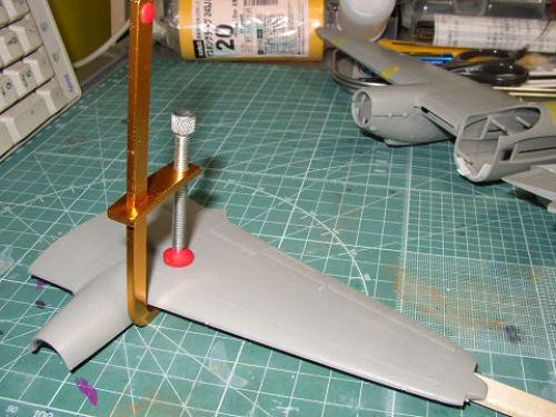 クランプと割り箸でモスキートの主翼の反りをとっています。かなり下に垂れ下がっていたので厄介です。とりあえずこの形で癖を付けたいと思います。先端までまっすぐになれば良いのですが。★☆うーん、カイロプラクティックでダメみたいです。orzこうなりゃ湯治しか無いですね。