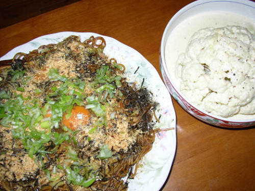 私流焼きそば。焼きそばに生卵、かつお節に葱。後は絡めて食べます。もう一品はカリフラワーのクリーム煮。カリフラワーを丸ごと煮込みます。見た目はごついが、軟らかく煮られるので崩しながらソースと一緒に食べます。野菜のホワイトシチューという感じです。