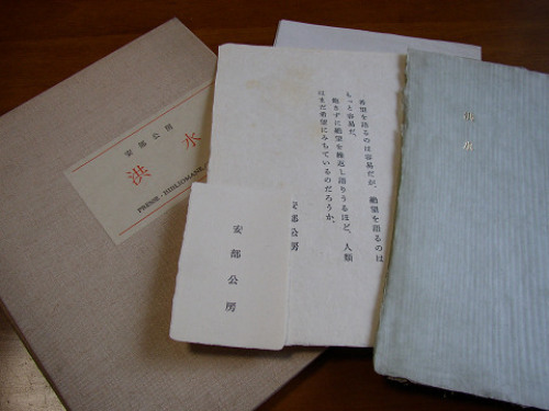 プレスビブリオマーヌ版 『洪水』 安部公房。585部限定出版手漉き雁皮紙。滋賀県無形文化財 成子佐一郎氏の手になる。天金。表題金箔押し。★☆プレスビブリオマーヌの贅沢な造りの装丁。安部公房の短編「洪水」貧乏な人々から人類は液化していき、どんどん地上を覆い尽くす。液化した人間は重力に逆らい、山を越え隣の町をも飲み込んでいく。最後の望みとなったノアの方舟は液化人類の海へ漕ぎ出す。