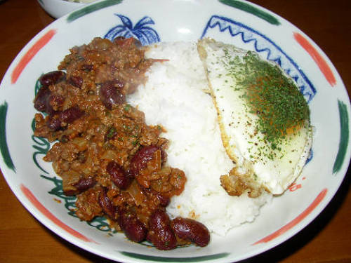 この料理を知ったのは「刑事コロンボ」。事あるごとに主人公のコロンボはチリコンカンを喰っていた覚えがある。アメリカ行ったらぜひ食べたい料理の一つだった。留学先のホストに「チリコンカン」を食べたいと言ったところ。「それは作ったことがない。サンディエゴまで食べに行こう」と言うことで(住んでいたのはサンディエゴの近くの山の中です)車で出かけた。昼食食べに朝早く(笑)食べてみたが美味いと言う感じはしませんでした・・・・日本に帰ってからチリコンカンの缶詰を知り自分なりにアレンジ。結構美味しくなりました。目玉焼きを添えています。大体、アメリカではライスで食べないし・・・(笑)目玉焼きにかかっているのは青海苔です。意外に合います。