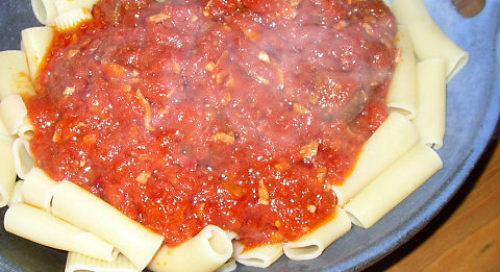ミートボールパスタをリガトーニで作りました。後はがさつに混ぜて頂きます。ミートボールは一度揚げているので香ばしくて美味しいです。 残り物は、次の日にそのまま食べるのは芸がありません。耐熱皿に移してチーズと生クリームを足してオーブンで焼きます。これが結構いけます。お試しあれ。