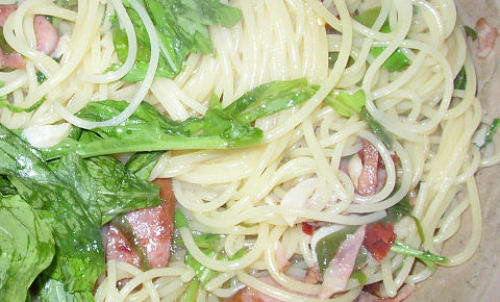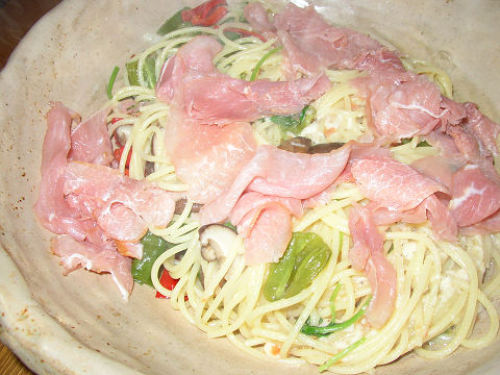 生ハムを使ったペペロンチーノです。生ハムはもちろん完成後に上から載せるだけです。ピーマンに見えるものは、同僚に頂いた、ぼたん胡椒です。