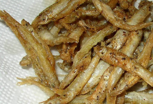 ちょっと小振りの公魚(わかさぎ)塩胡椒をして小麦粉を付けてオリーブオイルで揚げる。揚げると言ってもフライパンにひいた少量のオイルで充分。ビールにもワインにもピッタリの一品。僕は飲まないけれど(笑)カリカリに揚げて食べるとお菓子感覚だね。公魚美味い。