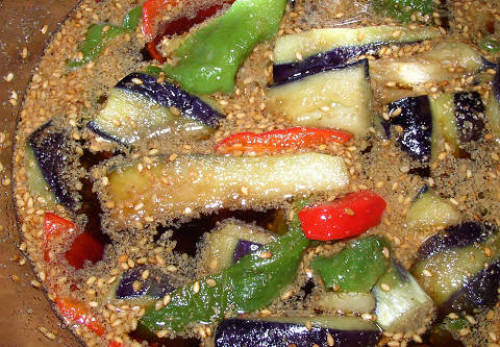 夏野菜の揚げ浸し。茄子、万願寺唐辛子、パプリカなんかを素揚げしてダシに投入。冷やして美味しい 夏野菜の揚げ浸し。