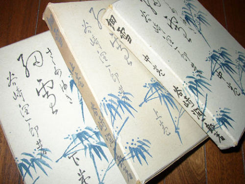 昭和21年版 『細雪』 戦時中、軍部から出版を禁止された谷崎は「細雪」上巻を私家版として200部作製。知り合いに配っている。その後、出版の目処も立たないまま、『細雪』は書き続けられ、戦後中央公論から発行された。それがこの21年版『細雪』上巻・中巻は昭和21年6月、下巻は23年12月と離れている。戦後間もない出版であるため、装丁、紙質は極めて悪い。★☆東宝の映画『細雪』監督市川昆も見たが・・・少し下品。