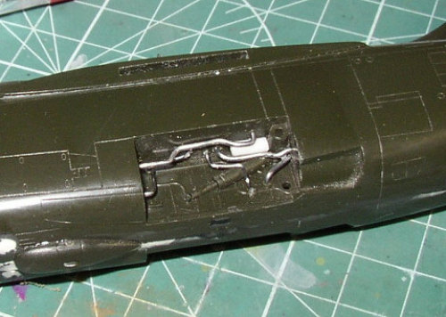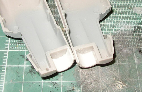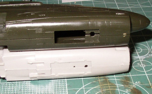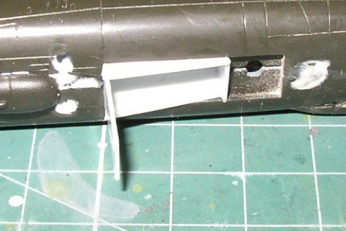 エッシーのコルセア2の前輪収納部は筒抜けなのでプラ板で整形しました。当然、はみ出た部分は接着後に切り取って削ります。気持ち程度のデッチアップです。 整形し直してこんな感じになりました。収納されるかどうかと言うより、筒抜けで尻餅防止用の錘が見えてしまうことが嫌でした。