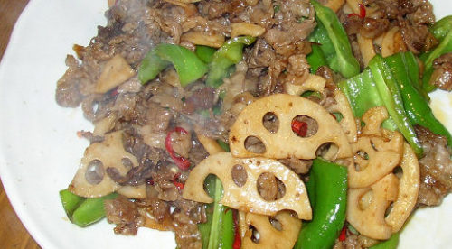 牛肉と蓮根の炒め物です。醤油と砂糖、紹興酒などを使って味を付けています。少し甘辛いですが。ご飯のおかずとしては抜群の相性です。肉はそれほど良いものを使っていません。その方が美味しいかも。蓮根はシャキシャキ感を残して。青みのピーマンも入れて。翌日の弁当のおかずにもしました。タップリ作っておくと重宝します。
