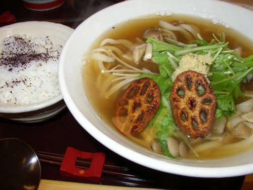 月末も近くなって、やっと今月のうどん定食が食べられた。今月は秋らしく「きのこうどん」まいたけ、しめじ、えのきが入っている。とくに珍しい茸が入っている訳ではないが。このうどんか美味かったのは、蓮根の素揚げ。これが香ばしくてアクセントになっている。鶏肉はあっさりしてフワフワ。それと生姜だね。見ての通りの大量の生姜と水菜。体が温まるし美味しい。ゆかりをかけたご飯と漬け物。800円。ごちそうさまでした。来月は何かな。