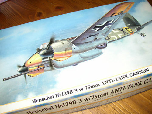 ハセガワのヘンシェルHS129B-3対戦車砲 1/72わー、もうこれは模型映えする機体です。対戦車砲を搭載したドイツ機というのはこれだけではないのですが、どうじゃこれ、すげーだろ、と言うように砲身が伸びているのが魅力です。模型だからこそ、こんな機体も作れるし集められる。しかも砲身は真鍮削りだし、砲の先はホワイトメタルと奢っています。しかし、ここまで来ると冷却穴まで開いているものが欲しい・・・贅沢。限定版でしたので買いそびれました。今回、入手。1000円ちょい。痺れますわ。(笑)