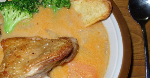 これがチキンクリームシチューだって? と言う声が聞こえそうですね。そう、我が家のチキンシチューは肉自体を煮込みません。しかしスープには鶏ガラで半日かけて取った白濁スープを使っています。これで鶏のスープは充分です。肉はじっくり皮目を焼いたローストチキン。ブロッコリーは別茹でのものを使っています。色目が鮮やかで綺麗です。ブロッコリーはシチューで煮るとすぐに形が崩れます。ポテトも煮込みません。カレーにはもともとポテトは使いませんが、シチューにはガーリックオイルでじっくり焼いたポテトを使用しています。表面はカリカリで中はホクホクです。煮込んだポテトはシチューのソースの味を濁らせます。ポテトはこの方が息子にも人気があります。一人でガツガツ入れて食べちゃう。我が家のシチューでした。