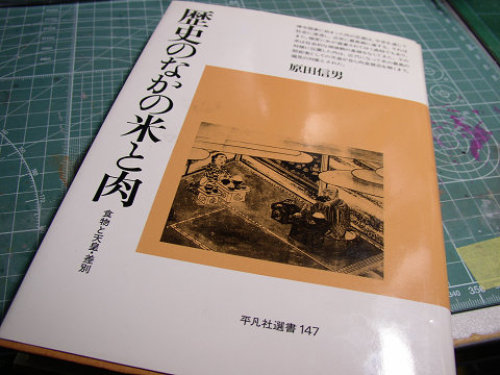 『歴史のなかの米と肉』 原田信男 平凡社選書日本人の生活の中でいかに米が大切なもので、肉がどのようにして入ってきたかという歴史的思想の中から食物史を考えるという本。天皇=米 肉=非農耕民として始まっている。勢いで行きましょう。職場でも人目を気にせず読めます。前の本の題名が強烈なんだよな。(笑)