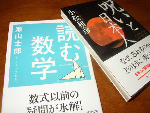 本屋に入ってついつい衝動買いです。一冊は瀬山士郎の「読む数学」特に数学が好きと言うわけではなく、どちらかと言えば苦手な方だが、こんな本を読むのは好きです。今月の25日に新刊の「読む数学 数列」が出ますのでそれまでに読んでおきます。 もう一冊はもと私の大学の先生、小松和彦先生の民俗学「呪いと日本人」若いころの高知でのフィールドワークから話が始まっています。久しぶりに、講義を受けているような気分になります。新鮮です。