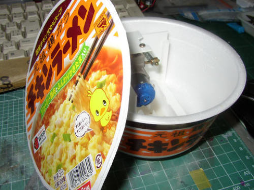 台風の影響で在宅。チキンラーメン丼の丼と蓋で遊んでいます。チキンラーメン丼にしたのはデザインがかわいいからです。わざわざスーパーを三軒も回って探しました。なかなか置いてないのであきらめていたら、家に一番近いコンビニで発見。なんだこんなところに有ったのか。(笑) ★☆コリコリ、ガキガキ、切ったり削ったりモーター組み込む枠を作ったり。行き当たりばったりの現物合わせで作っています。夏休みの工作みたいだ。