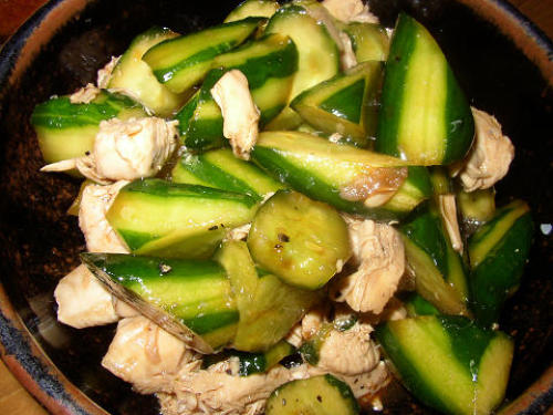 なんて言ったらいいのだろう。胡瓜を軽く塩もみしてタレに浸ける。蒸したササミを混ぜるという簡単な料理。しかし、これは結構美味い。新鮮な胡瓜が瑞々しくて良いのだ。あっさりしたササミとも合っている。この胡瓜は朝摘みの胡瓜だ。商品にはなりにくい曲がり胡瓜。