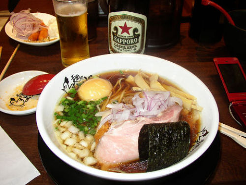 こちらは同行者が食べた「醤油そば」すっきりとしたスープに大きな叉焼(ローストポークのようでした)。スープの味は甘い。甘い醤油味なんです。これはビックリ。美味しいです。意外な感じのスープの味でビックリしました。私は車を運転していますので、ビールはなし。激辛のチョリソーを頂きましたが、こちらは普通の感じです。★☆今度はディフォルトの「塩そば」食べてみよう。