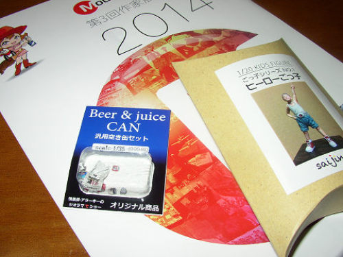 モデラーズエキスポ2014に行ってきました。雨がしとしと降る朝でしたが、大阪南港に着いた昼には、雨は上がり気持ちの良い海風が吹いていました。京都から一号線を走り、森口から阪神高速に乗ったのですが、一号線がメチャメチャ混み。いい加減に疲れました。去年も感じたのですが、南港の辺りには倉庫が多く、トラックの量が半端ないです。結構、アジアトレードセンターに近づくとその走りにビビりますね。(笑) 今年も釘宮さんにお話が出来ました。なんと去年お話したことを覚えてくださっていて挨拶いただけました。釘宮さんのノルマンディ上陸作戦の連作は何度見ても凄いです。今年の新作趣向を変えて硫黄島上陸作戦と言うことです。この作家展に来ると、見る方が先行して、しかも圧倒されるので写真が撮れないのです。興奮してみていて、作家さんに声をかけて頂くと興奮して、それ以上何もできなくなってしまいます(笑)情けなや。 今年は荒木さんとも話が出来ました。たくさんの人から話しかけれておられましたので、なかなか時間は取れませんでしたが楽しかったです。いつ見ても凄い作品です。ろーがんず杯で出品された「赤城」もありました。「これが本当の赤い城『赤城』です」しかし、凄いですね。ただし、これも画像なし。大体、作家さんと話をして画像撮りまくるというとこまで心が回りませんわ。★☆今日の成果は荒木さんの「一般汎用空き缶」1/35と彩人さんの「ヒーローごっ子」1/20を買いました。去年は空き缶が売り切れていたんだよね。12時から発売だったので、時間になったら急いでいきました。(笑)今年はやっとゲットです。
