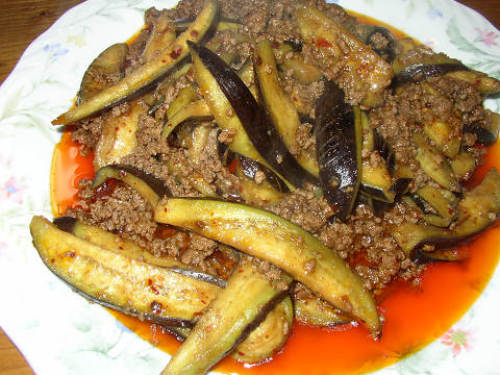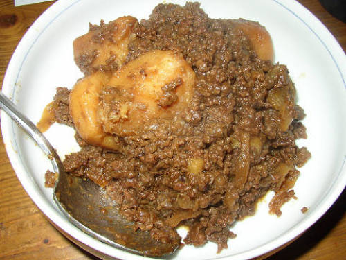 肉じゃがをミンチで作ります。これは海外で肉じゃがが食べたくなったとき、スライスビーフがないので、粗びき(日本よりかなり粗びき)のビーフで作ったのが最初です。見た目は悪いですが味はしっかり肉じゃがになっています。私の肉じゃがは味が濃いのでご飯に載せれば、十分おかずになります。