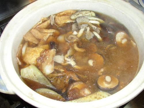味噌仕立てのきのこ鍋です。中には鶏肉、豚肉、きのこ各種(天然のなめこがやたら美味かった)、レンコン、茄子なんかが入っています。そうそう、豚肉はカリッと焼いてから入っています。鶏肉も皮目をぱりぱりに焼いています。その方が、スープが香ばしくなります。 当然、油揚げ(私の大好物です)も入っているよ。我が家では、ダシを大目に作って最初から饂飩を投入します。そう、でかい「きのこうどん」ですな。具はデカいし半端なく美味しいです。なめこが入っているのでスープがちょっとトロリとしています。なめこ汁だぁ。