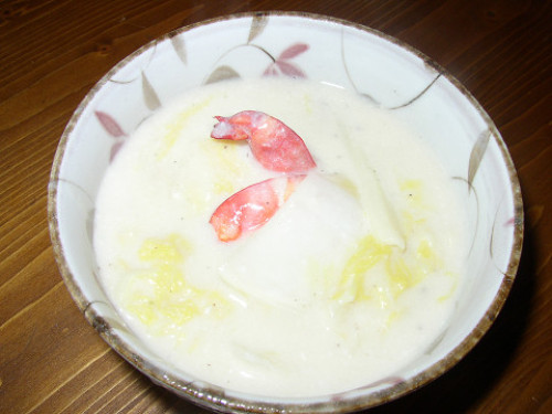白菜の季節です。美味しく食べたいから「海老と白菜のクリーム煮」にしてみました。優しい味です。牛乳を使っているのでチャウダーのようでもあります。ここに浅蜊が入ったらそんな感じかな。ボールに入れて食べるのは冷えにくくするため。海老は背を大きく割ってデザイン的に美味しそうに見せています。