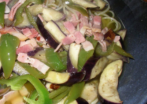 茄子が美味いですなぁ、この季節。たくさん茄子を仕入れてきましたのでパスタにしてみました。ベーコンとニンニク、唐辛子を炒めて茄子とピーマンも少し炒めます。たっぷりのオリーブオイルでね。そこにパスタの茹で汁とトリフ塩(塩の中に細かなトリフが入っています)で味を調えてパスタ投入。爽やかで美味いです。茄子とピーマンは火をあまり通さず、ソースのオイルが熱いので、それで徐々に火が通るようにしました。